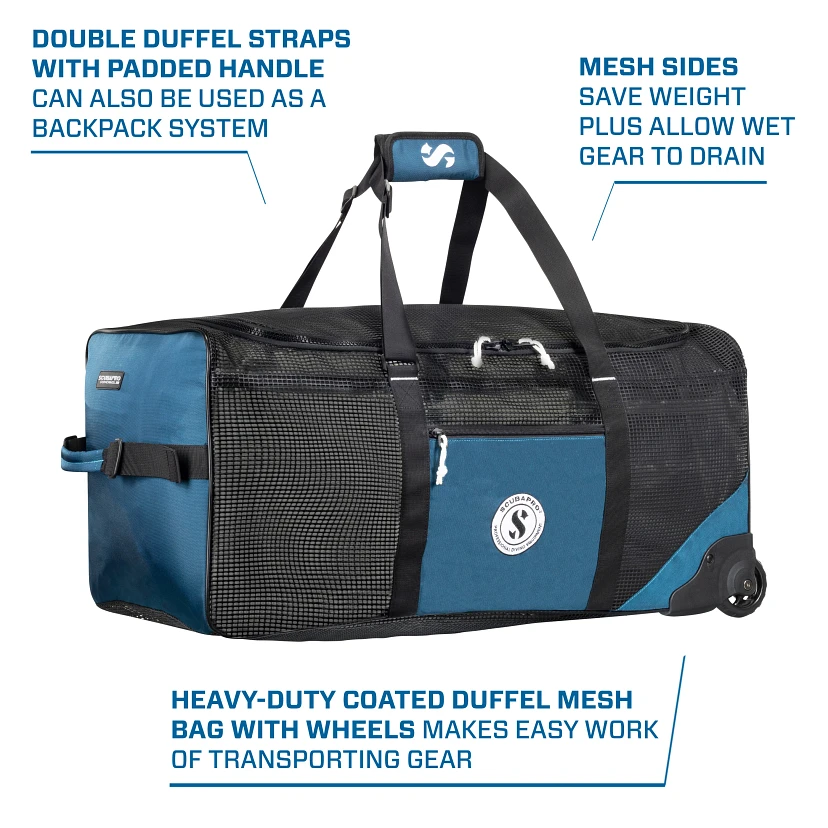 The new Sport Mesh ‘N Roll 100 is a heavy-duty coated mesh duffel bag on wheels. On your way to the dive site you can roll the bag or carry it like a backpack by using the double-duffel straps. On your way back from the dive site, the roller wheels enable you to avoid soggy gear drenching your backside. This bag is lightweight yet durable while offering a massive amount of cargo-carrying capability.